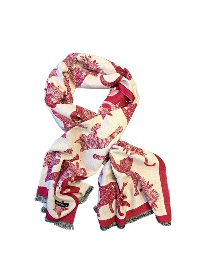 Elegantní dámská šála z jemné kašmírové směsi s originálním motivem koček potěší každou milovnici stylu i pohodlí. Díky rozměrům 180 × 65 cm se dá nosit na mnoho způsobů – kolem krku, přes ramena či jako lehký přehoz.
