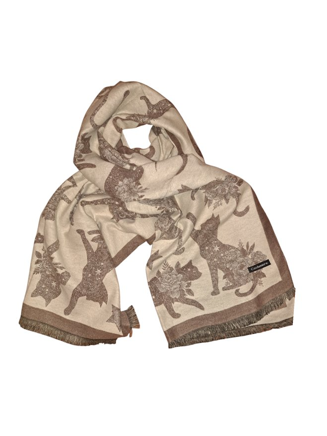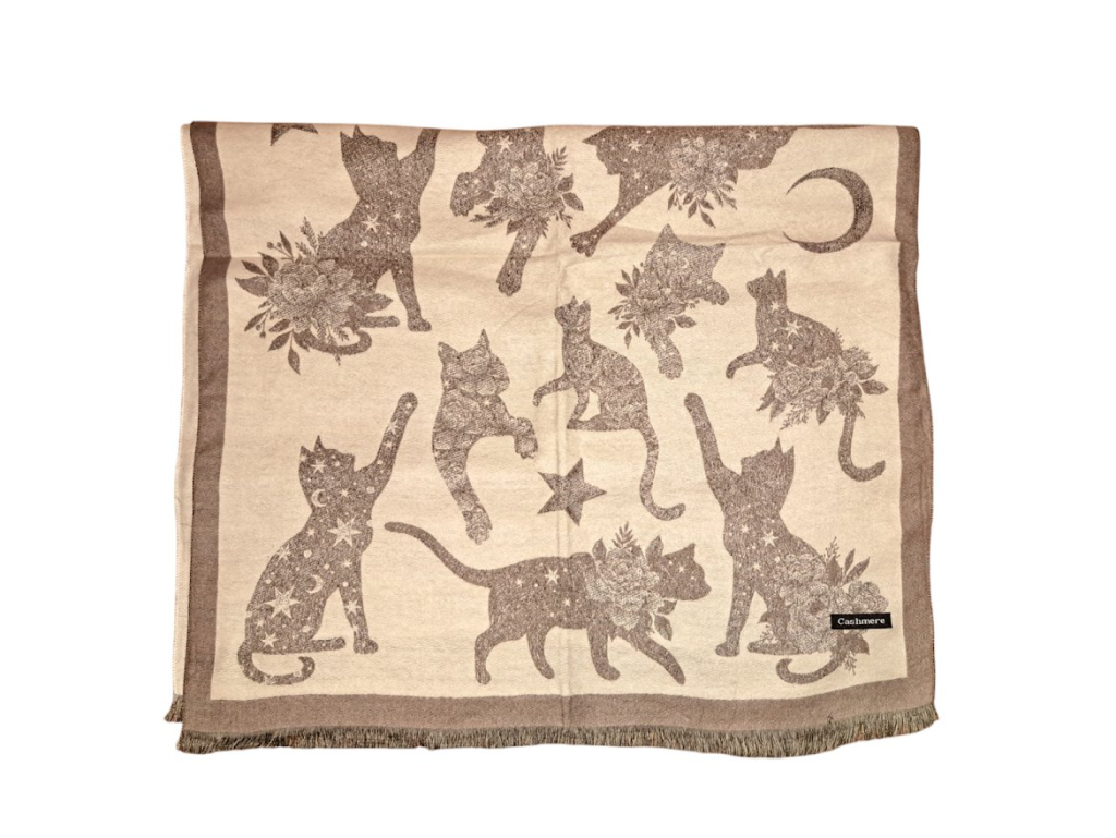 Elegantní dámská šála z jemné kašmírové směsi s originálním motivem koček potěší každou milovnici stylu i pohodlí. Díky rozměrům 180 × 65 cm se dá nosit na mnoho způsobů – kolem krku, přes ramena či jako lehký přehoz.