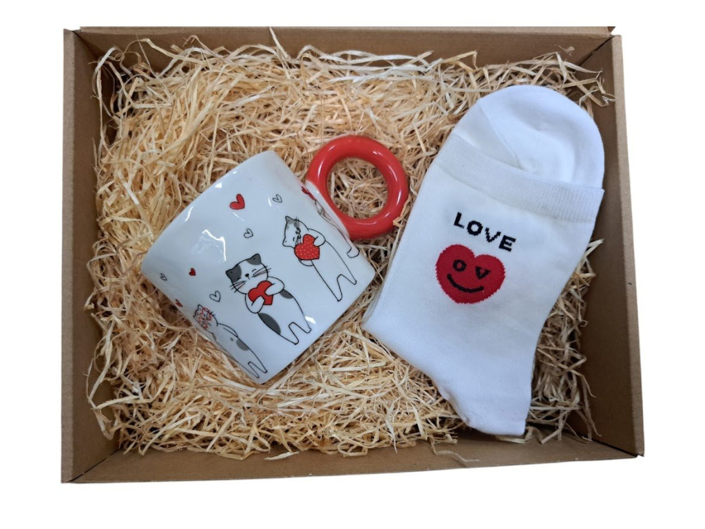 Sada obsahuje krásný porcelánový hrneček o obsahu 300ml se zamilovaným motivem a srdíčkové ponožky