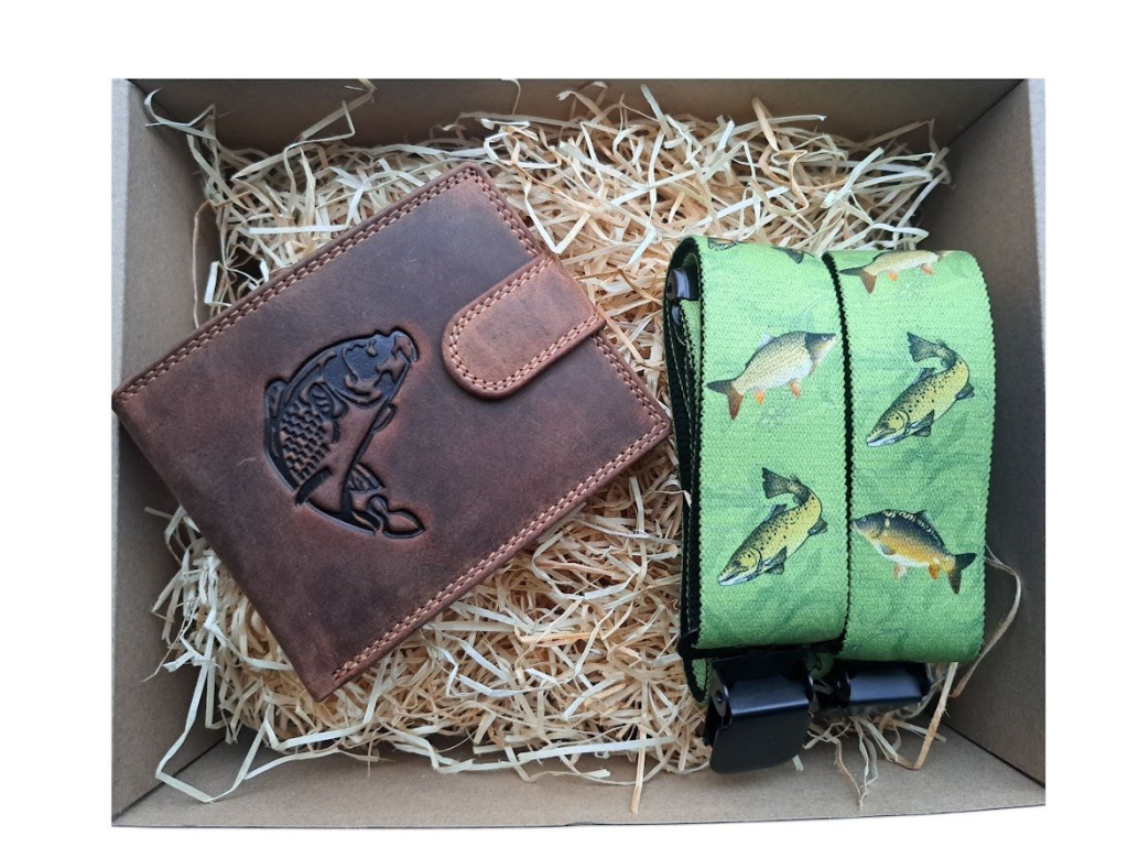 Dárkový set pro muže - Kožená peněženka a kšandy ryby