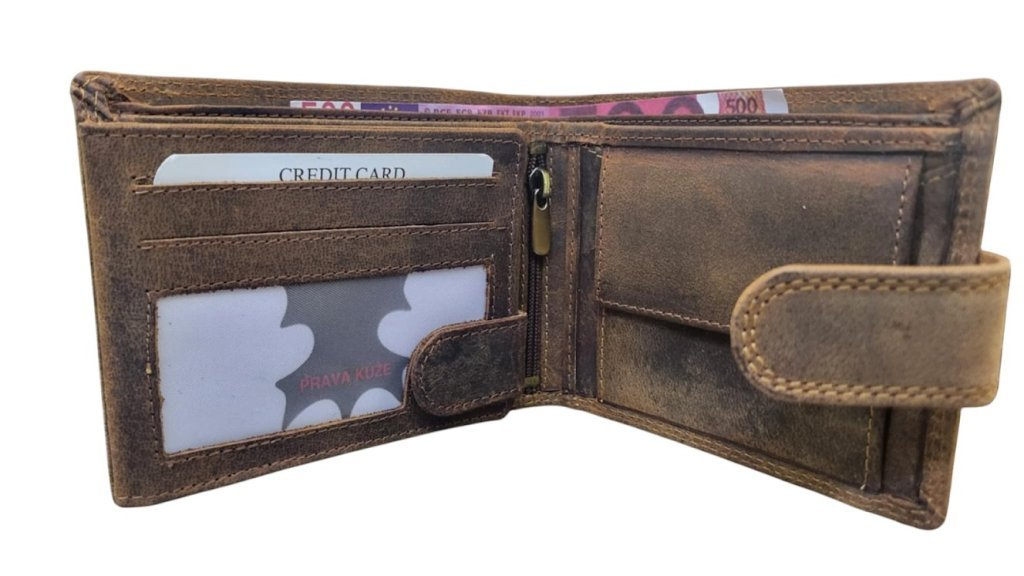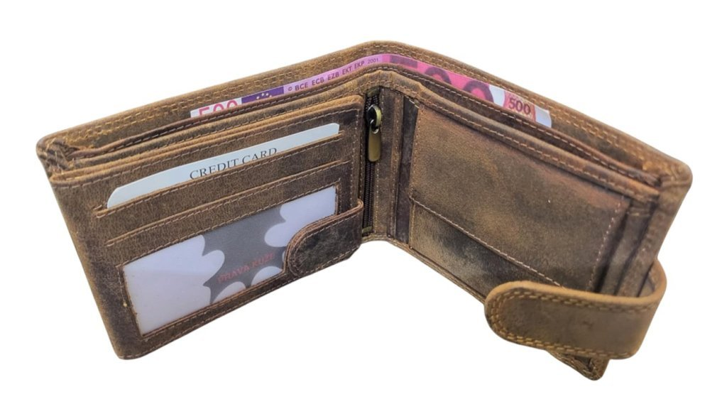 Pánská peněženka z pravé kůže s motivem. Rustikální a přírodní styl. Přední strana je ozdobená velmi pečlivě vyraženým motivem.