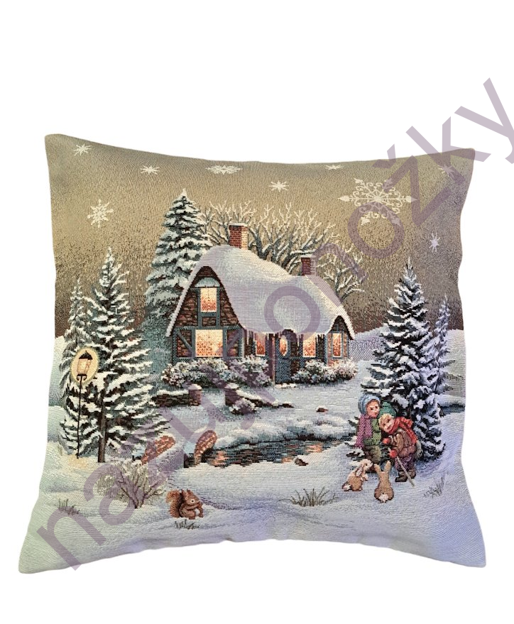 Vánoční povlak na polštář s vánočním motivem zasněžené krajinky s chaloupkou